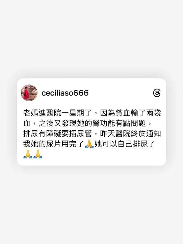 昨日(12月12日)苏恩磁突然在社交平台透露妈妈入院的消息,令人担忧:“老妈进医院一星期了,因为贫血输了两袋血,之后又发现她的肾功能有点问题,排尿有障碍要插尿管,昨天医院终于通知我她的尿片用完了,她可以自己排尿了。”